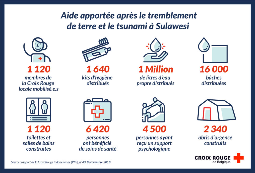 Le Mouvement de la Croix-Rouge et du Croissant Rouge, présent dans 196 pays, a immédiatement lancé un appel urgent aux dons. En Belgique francophone, 937 personnes ont répondu à notre appel à solidarité. Ensemble, nous avons récolté 65.726€ , auxquels sont venus s’ajouter 235.168€ du Consortium 1212. Nous avons donc pu envoyer un total de 300.894€ aux unités de secours en Indonésie.